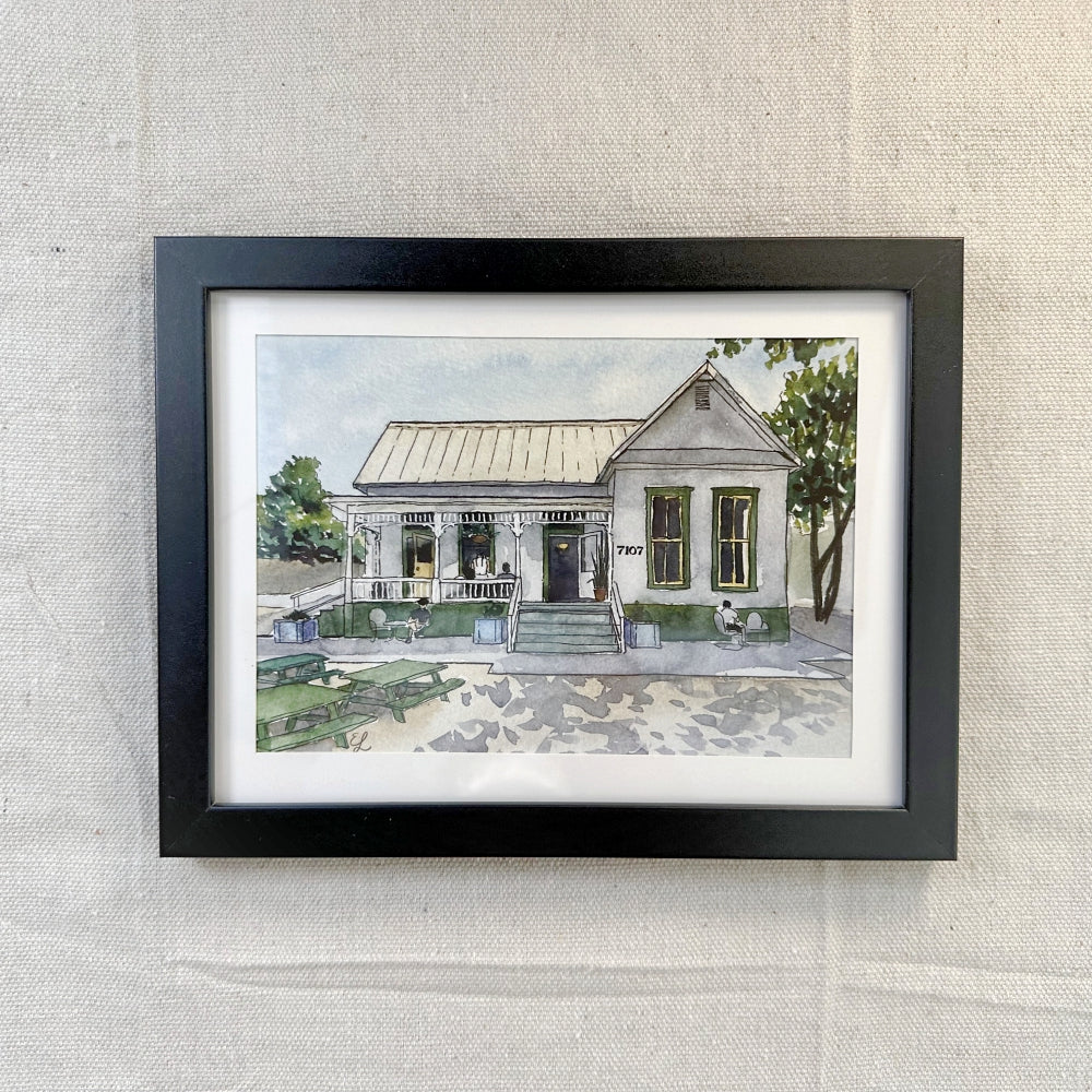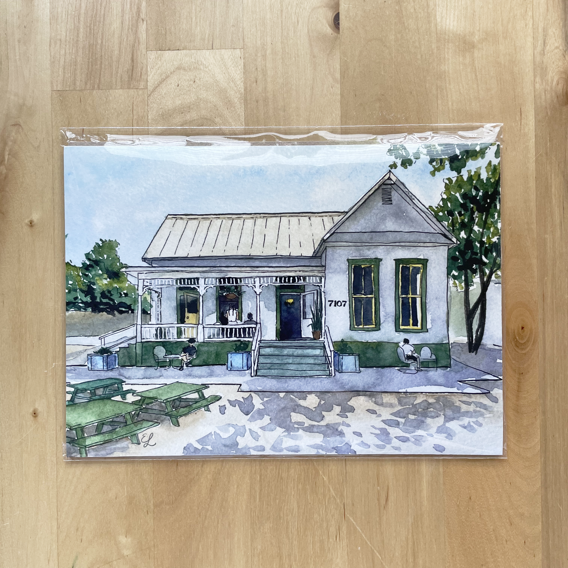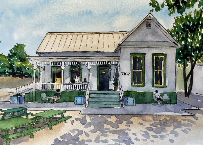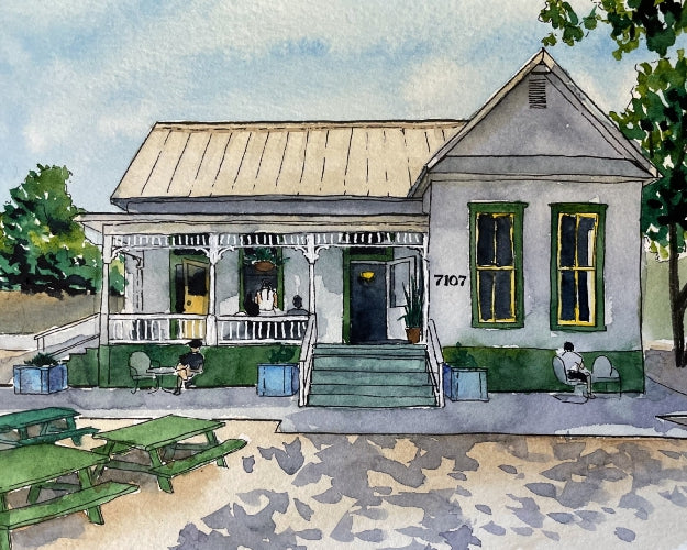 Ani's Day and Night is a café and bar situated in Austin, Texas. Its white facade is decorated with green and yellow trims, green picnic tables, and white gabled details on the porch. A tall tree casts picturesque, purple-tinted shadows across this watercolor painting of its home-converted building.