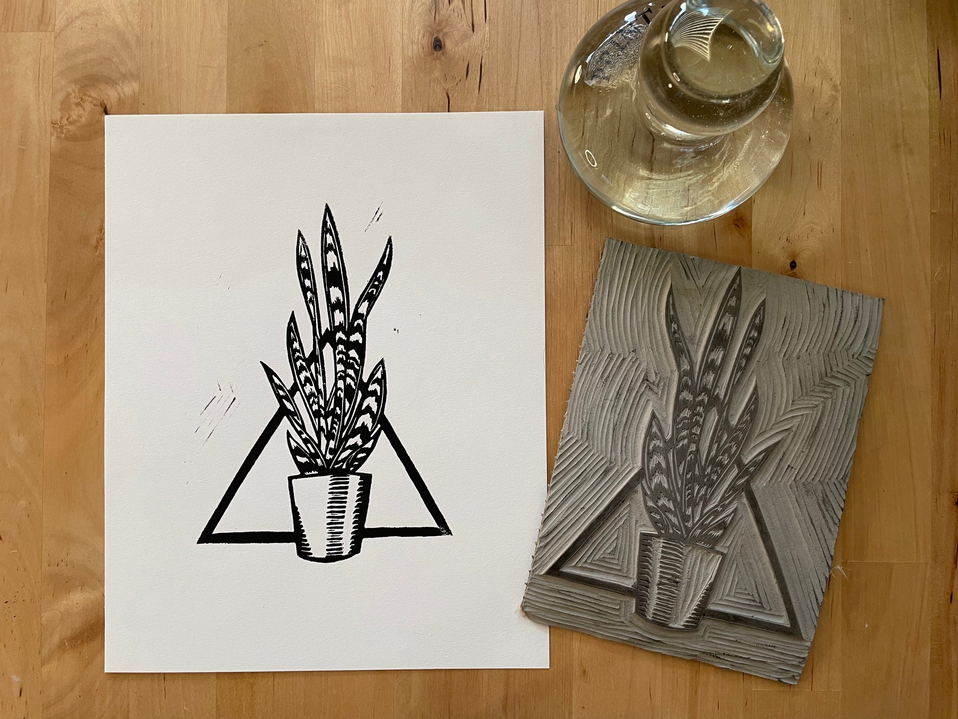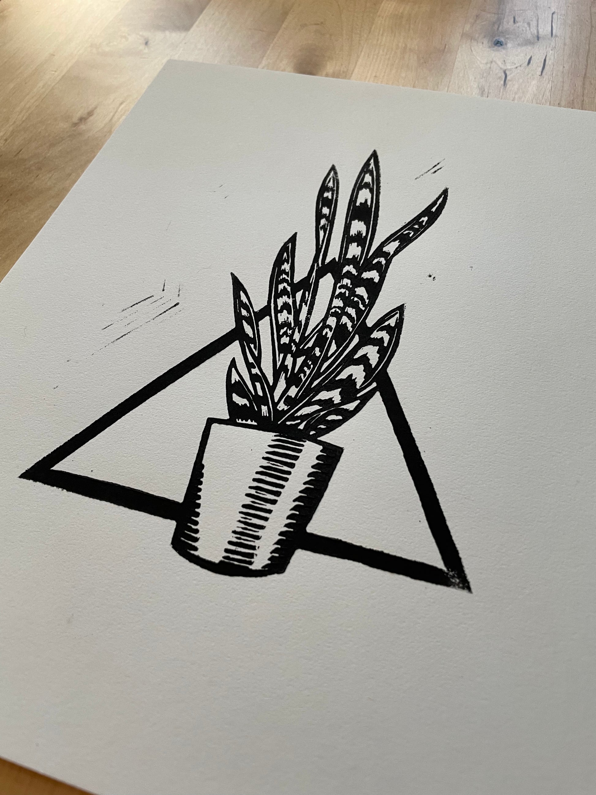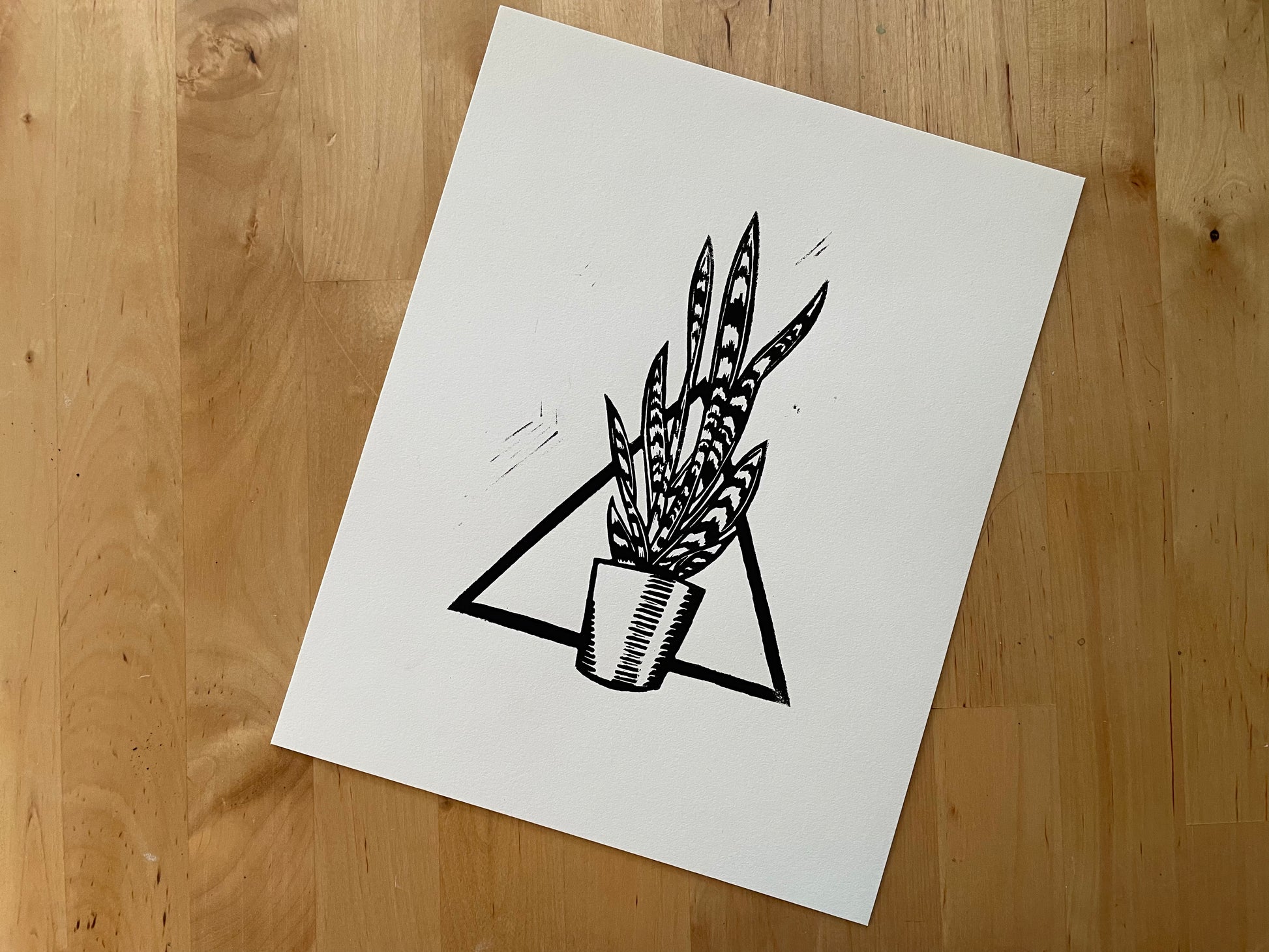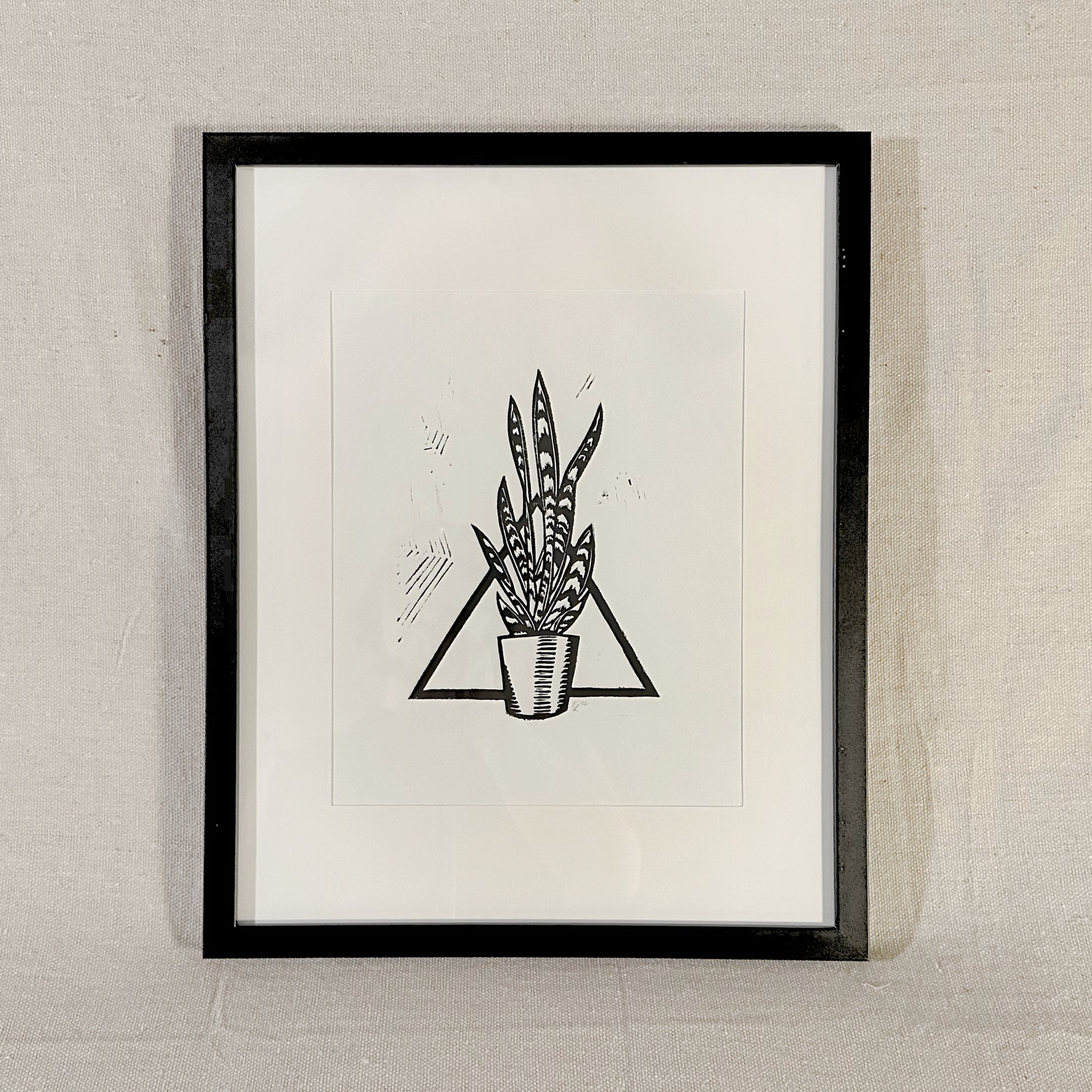 Sansevieria Laurentii rendered in black ink, stripes reflected by a triangle in the background. Take your style game to the next level with this elegant and sophisticated design! Make a bold statement that will turn heads in any room.