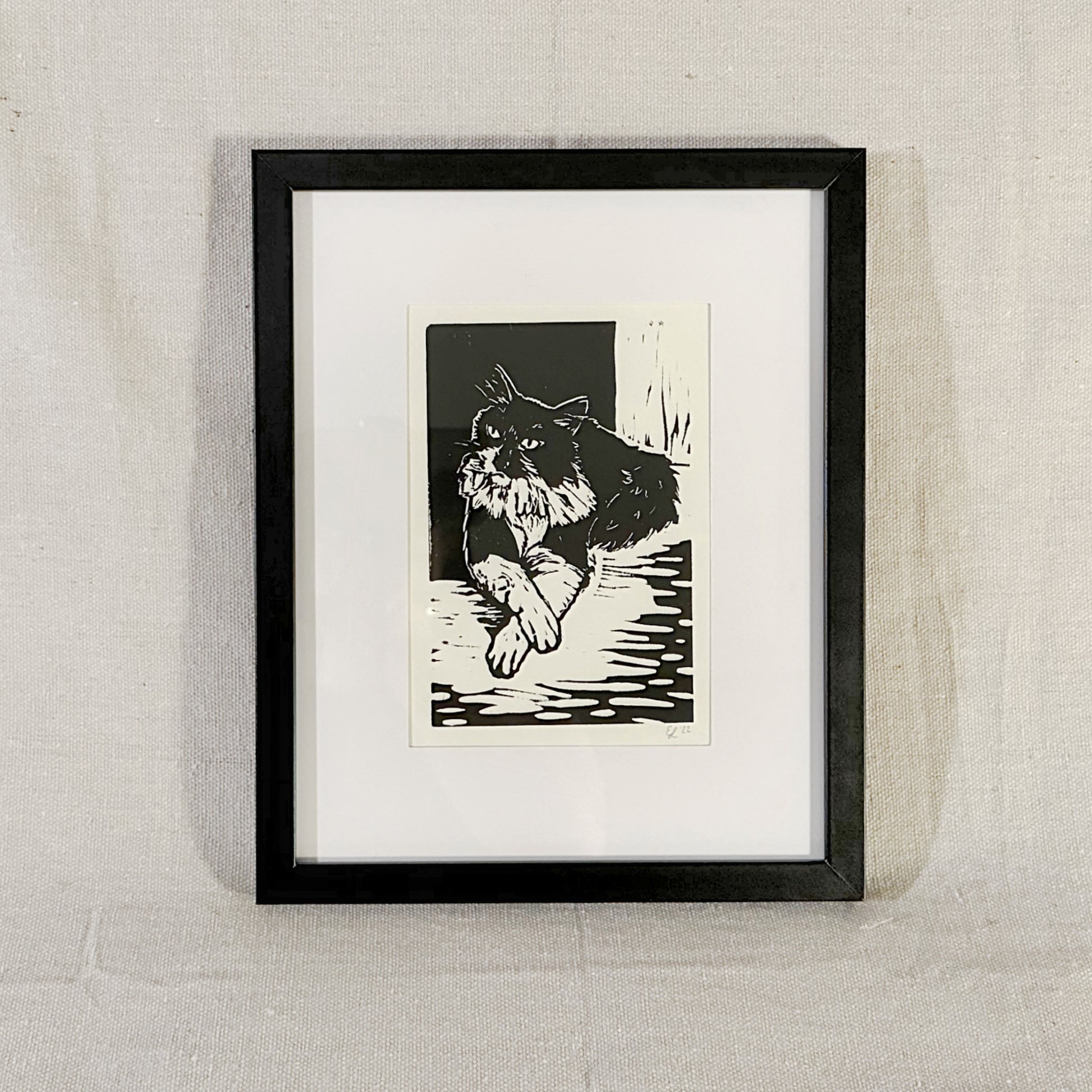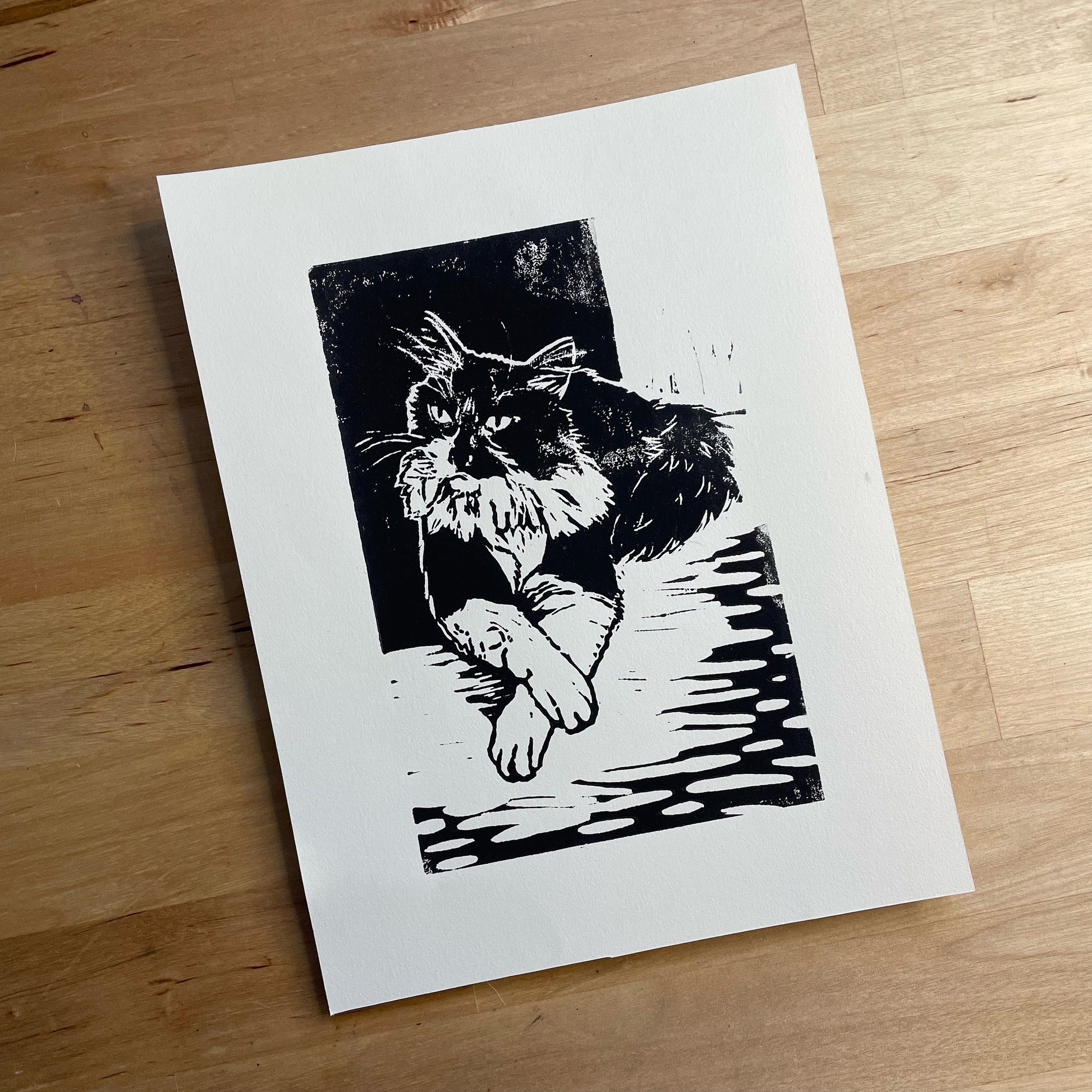 Handmade Linocut block print featuring a long-haired tuxedo cat with crossed paws - or "polite paws" as I call them. Inspired by David Rose. This design captures the beloved personality of these cats in timeless detail. Add sophistication and charm to any room with a Tuxedo Cat.