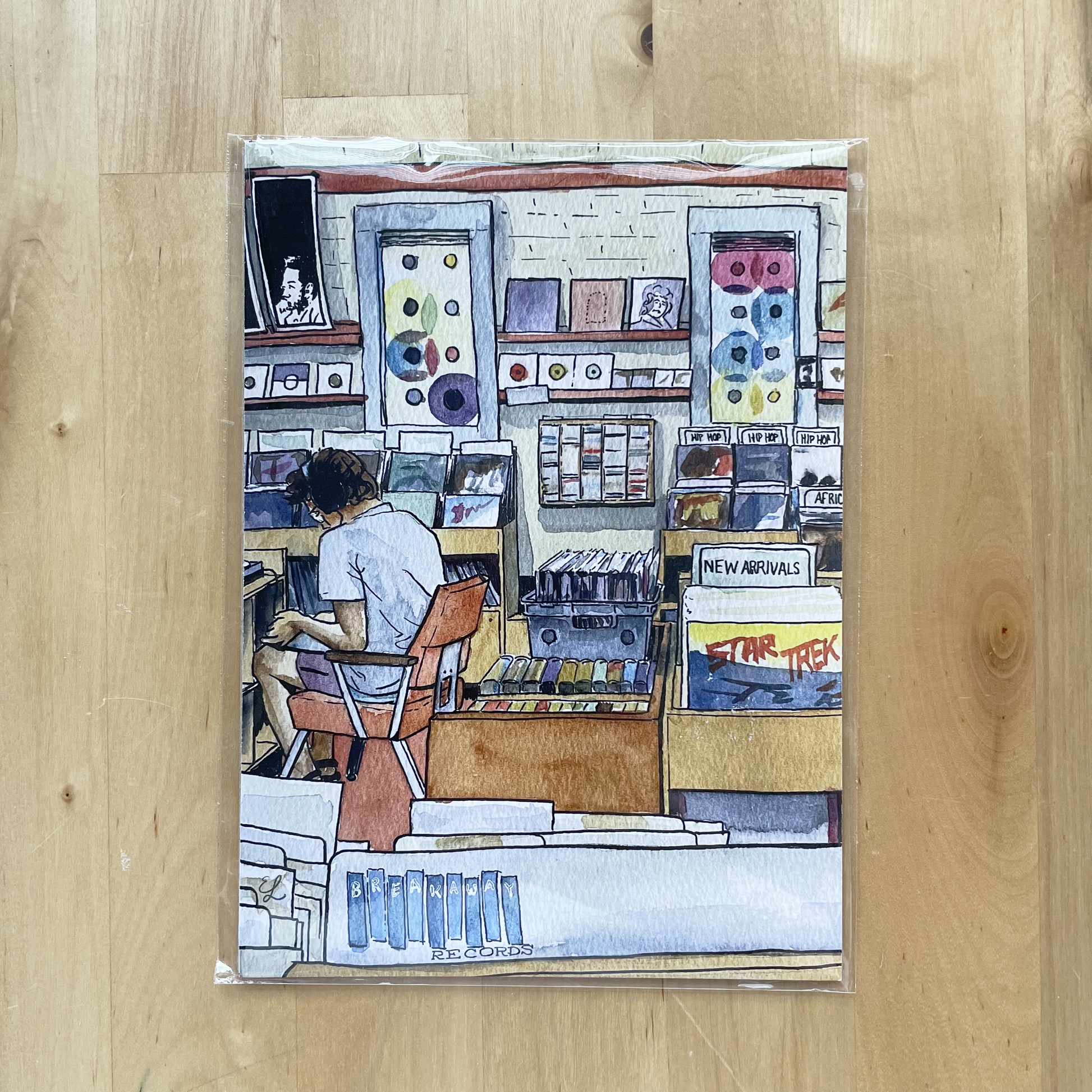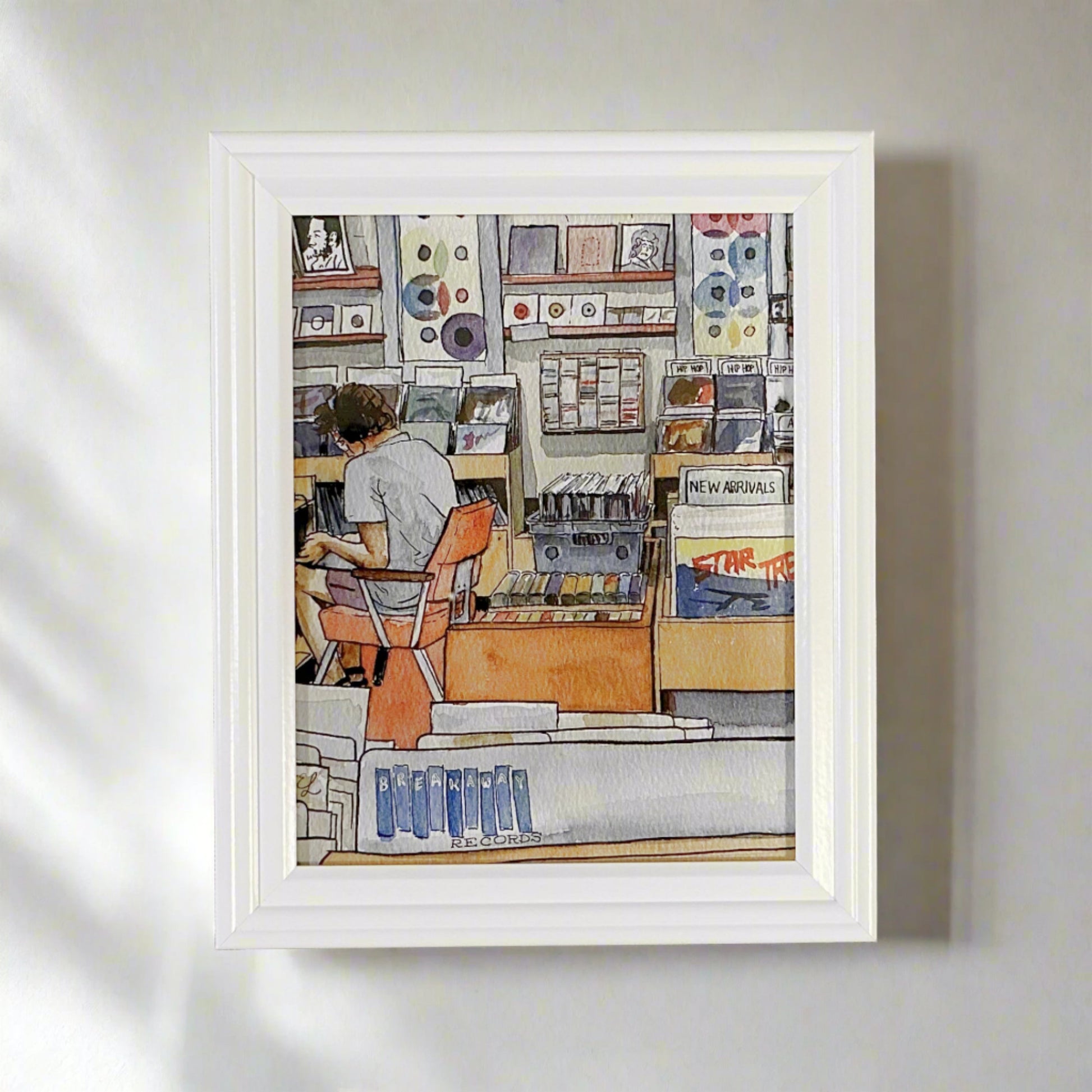 Watercolor sketch glancing across rows of vinyl records, LPs, and cassettes at East Austin's used record shop. A seated patron wearing headphones listens to an album among the colorful edges of case art. Colored light glows through two windows covered in translucent vinyl.