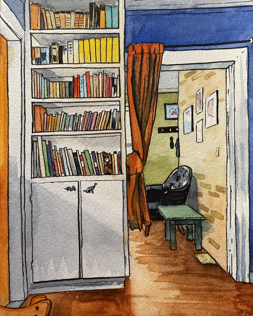 Cozy wood floors, dark blue walls, and a colorful bookshelf invite you to sit and stay a while in this coffee shop. The orange-curtained room and brightly-lit art draw you into the corner nook behind the bookcase at Genuine Joe's in north central Austin in this watercolor painting.