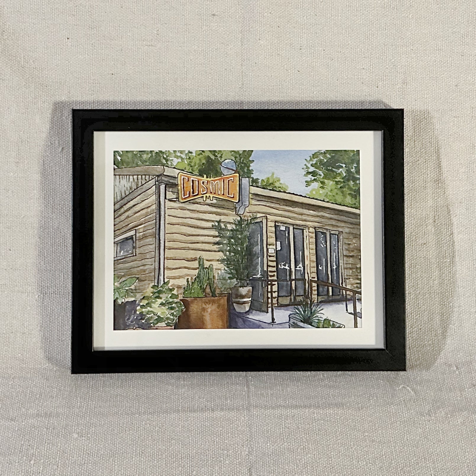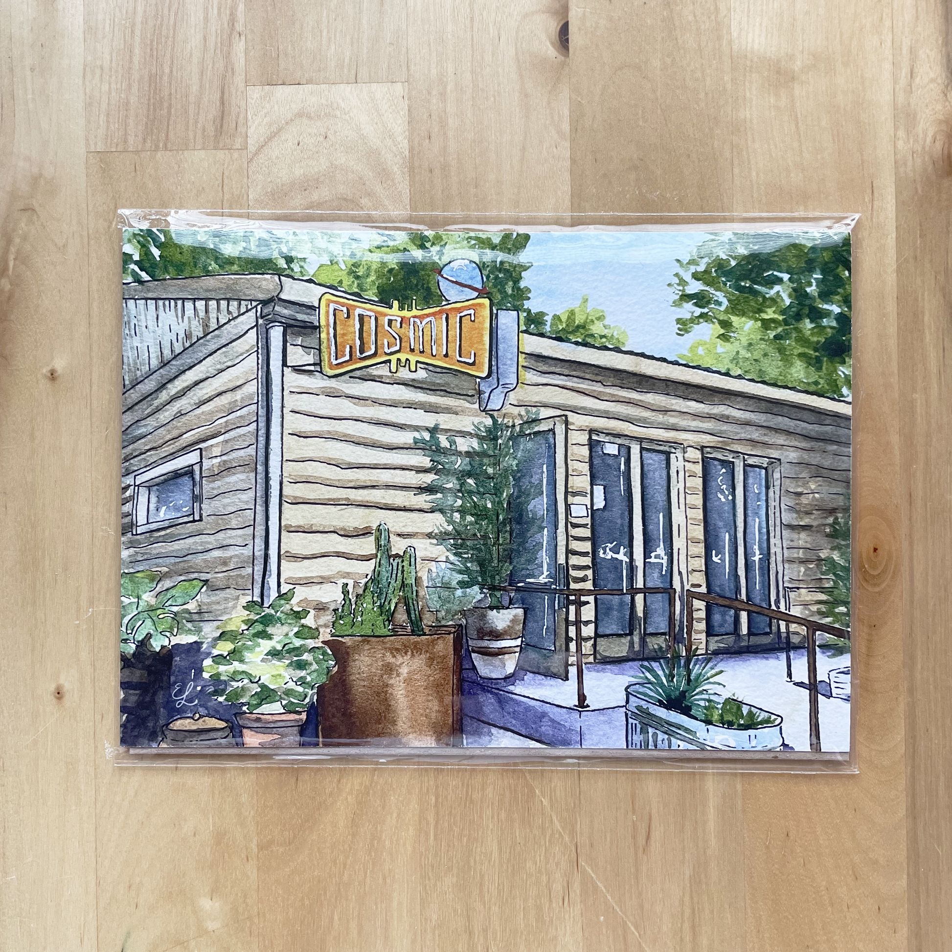 This watercolor sketch features the Cosmic Coffee & Beer neon orange and yellow retro-style sign and its reflective ringed globe. Brown live-edge wood planks, planters, and Texan foliage decorate this storefront on a background of a blue sky and treetops. A vibrant, one-of-a-kind view - perfect for adding a little of that Lone Star State charm to your space!